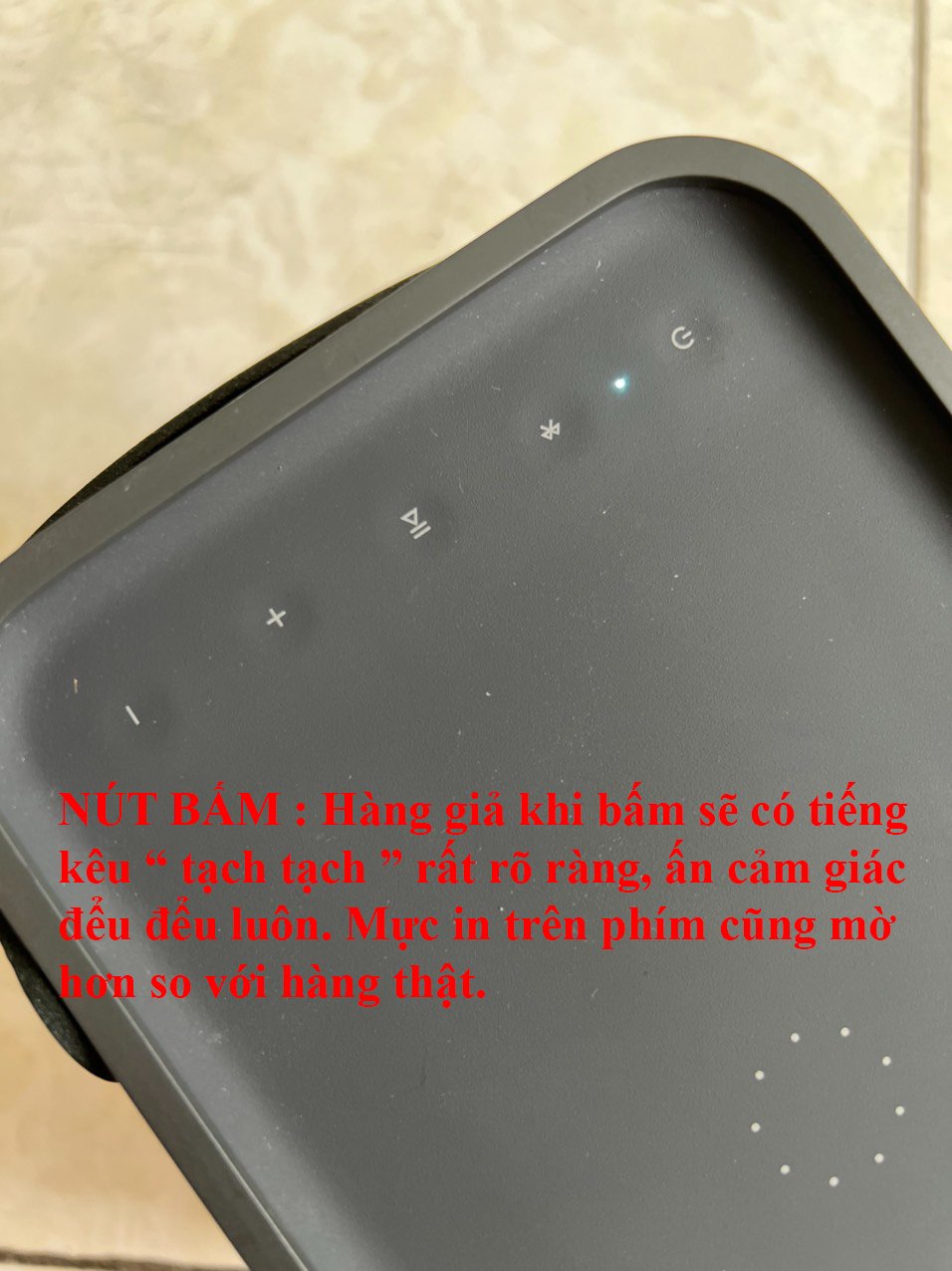 + Nút bấm : Nút bấm trên loa sẽ kêu " Tạch tạch " có phần kiểu hơi tàu. Nút của loa xịn thì sẽ âm và gần như không kêu khi bấm.