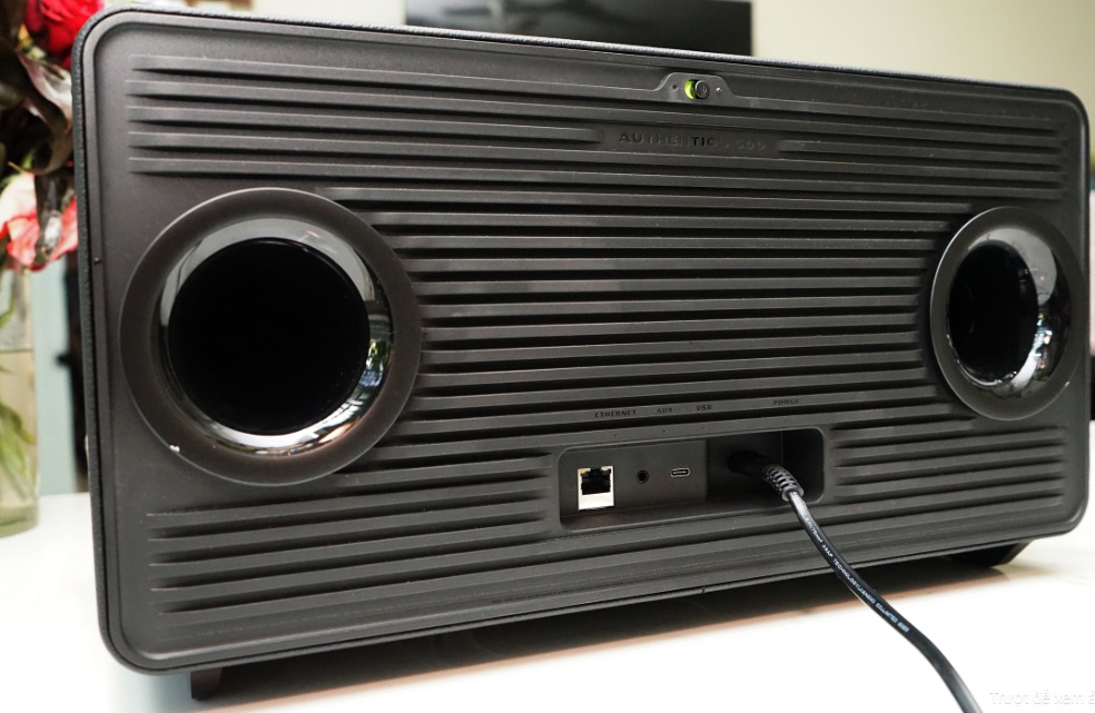 Đến với mặt sau chúng ta sẽ có 2 cổng thoát hơi bass-port, việc này sẽ giúp cho loa có được dải bass uy lực, độ thoát tốt với độ động cao, hạn chế nhiễu méo hài âm ở dải trầm. Khu vực ở giữa phía trên là nút gạt tắt mở tính năng ra lệnh bằng giọng nói cho trợ lý ảo Google Assistant hay Alexa.