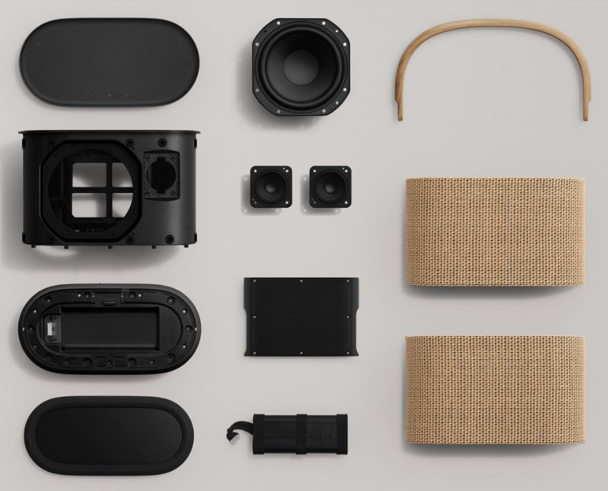 Ngay từ cái nhìn đầu tiên, Beosound A5 gây ấn tượng mạnh với vẻ ngoài tối giản nhưng đầy tinh tế. Sự kết hợp giữa vật liệu cao cấp như gỗ sồi, nhôm và vải dệt khiến chiếc loa này trở thành một món đồ nội thất trang nhã, phù hợp với mọi không gian sống.