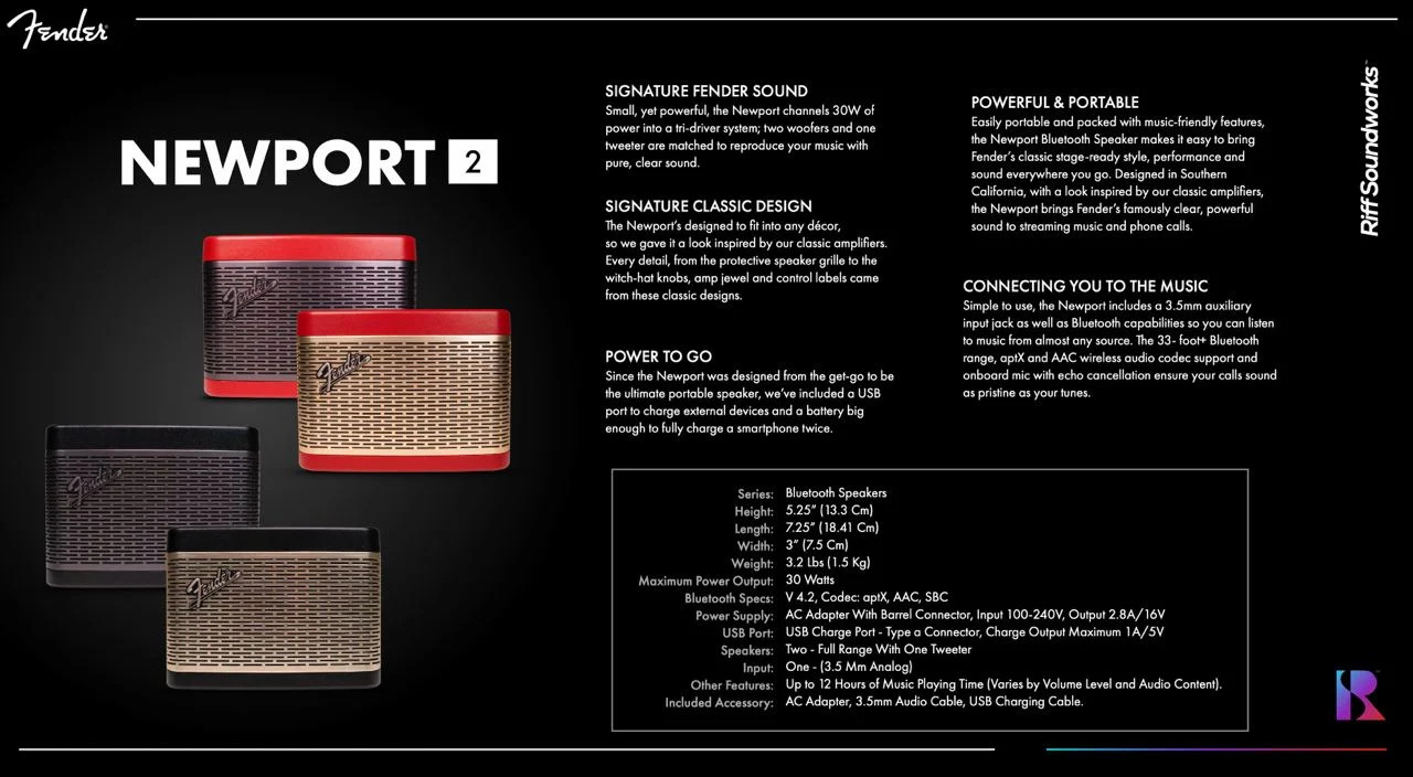 Fender Newport 2 sử dụng chuẩn Bluetooth V4.2, aptX, AAC, SBC với khả năng kết nối ổn định, chất lượng, âm thanh truyền phát với tín hiệu chuẩn xác, không bị giật lag. Với trang bị kêt nối không dây này, loa cho phép bạn thưởng thức nguồn nhạc bất tận thông qua một vài thao tác kết nối đơn giản với các thiết bị thông minh khác như điện thoại, laptop, ipad...