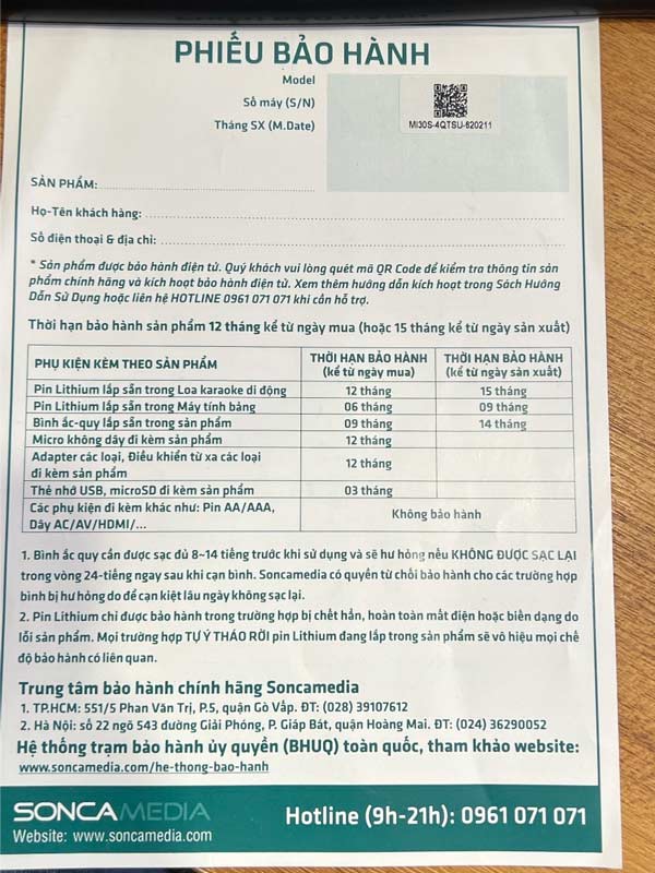 + Để được hưởng đầy đủ mọi quyền lợi bảo hành sản phẩm chính hãng của SonCaMedia, quý khách vui lòng nhập đúng thông tin: HỌ & TÊN cùng SỐ DI ĐỘNG của mình khi kích hoạt bảo hành điện tử