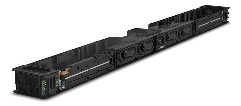 Loa Bose Smart Soundbar 900 được trang bị hệ thống củ loa với 4 woofer racetrack chia đều cho kênh trái và phải, 1 tweeter ở giữa và 2 củ loa lưỡng cực hướng trần khả năng tái tạo âm thanh đầy đủ và chi tiết mọi dải tần.