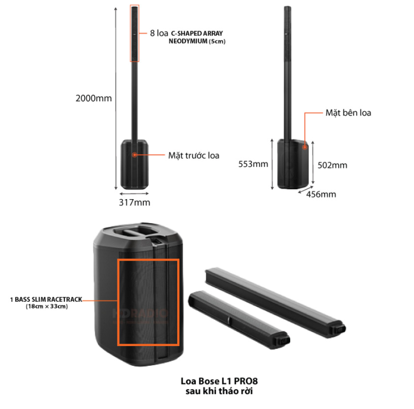 Loa Bose L1 PRO8 có thiết kế column array hoàn hảo để tháo lặp, thiết lập nhanh chóng bao gồm: 1 hệ thống sub liền mixer kết hợp với 1 thanh loa ARRAY cùng 1 thanh nâng chiều cao (để tùy chọn cài đặt trong những sân khấu lớn).