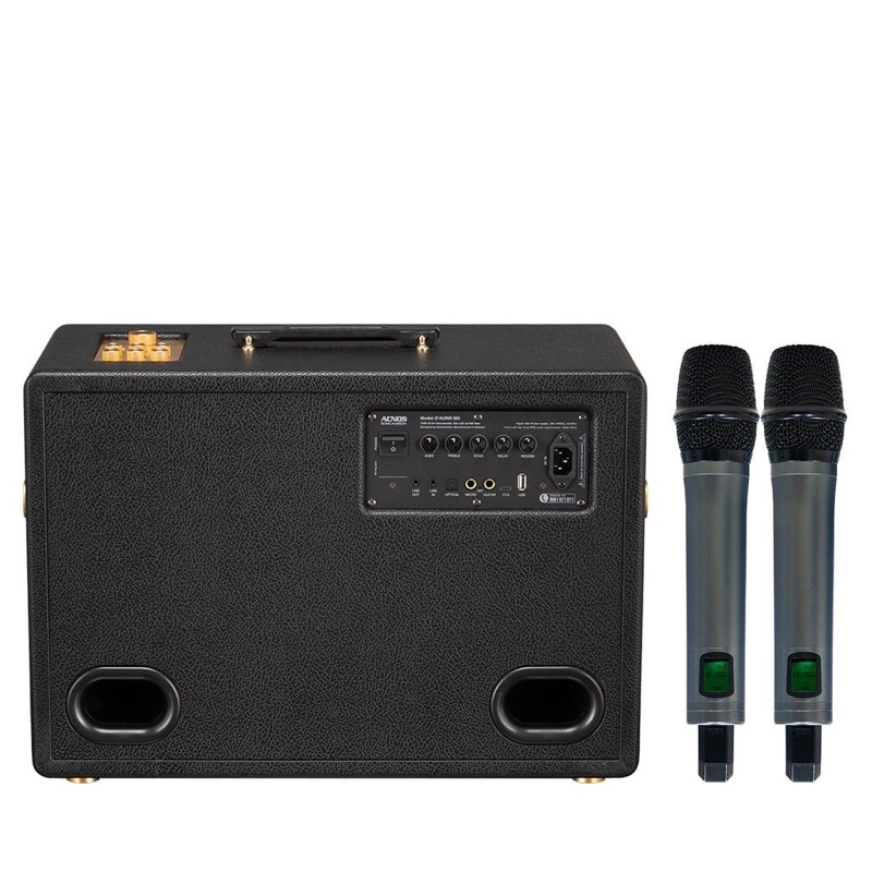 D'Auris 500 có đầy đủ cổng kết nối cho karaoke gia đình và sự kiện nhỏ: Bluetooth 5.0, Optical IN (kết nối Smart TV không độ trễ), USB-C OTG (đọc nhạc từ điện thoại hoặc USB), USB Type-A, Line IN/OUT 3.5mm, và 2 cổng 6.35mm cho micro có dây và guitar. Đi kèm 2 micro UHF không dây stereo trong hộp.