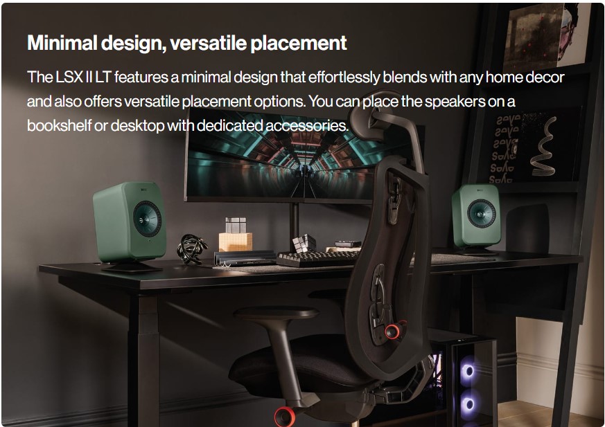 KEF LSX II LT vẫn giữ nguyên thiết kế tinh tế, nhỏ gọn như LSX II, với các đường nét liền mạch, mượt mà. Đem đến một tổng thể cuốn hút, sang trọng nhưng vẫn rất gọn gàng, tối giản.
