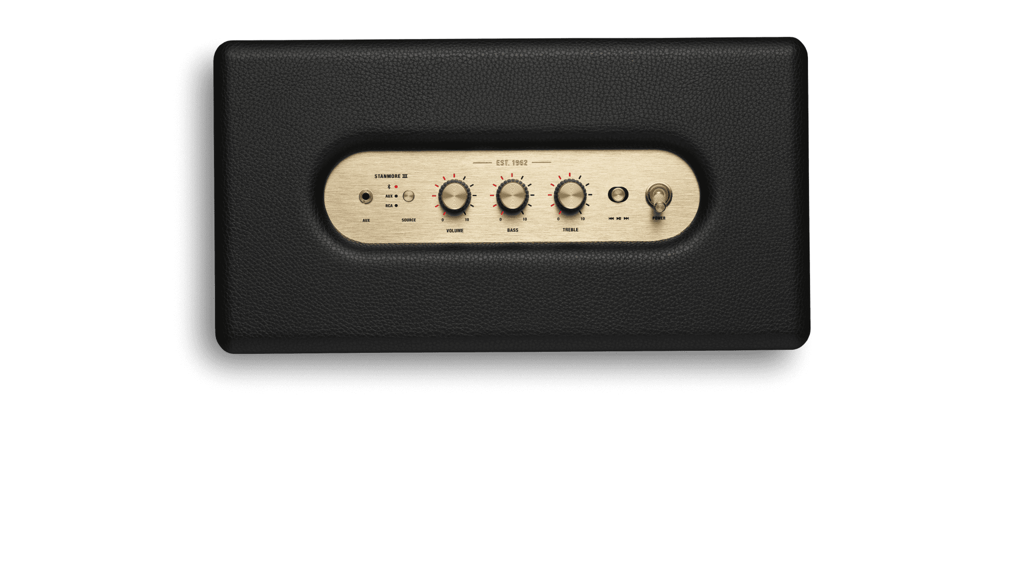 Loa Marshall Stanmore III sở hữu thiết kế cổ điển mang đậm nét đặc trưng, truyền thống của Marshall. Toàn bộ khung viền được bọc da tổng hợp, logo chữ viết biểu tượng tạo nên sự chắc chắn.