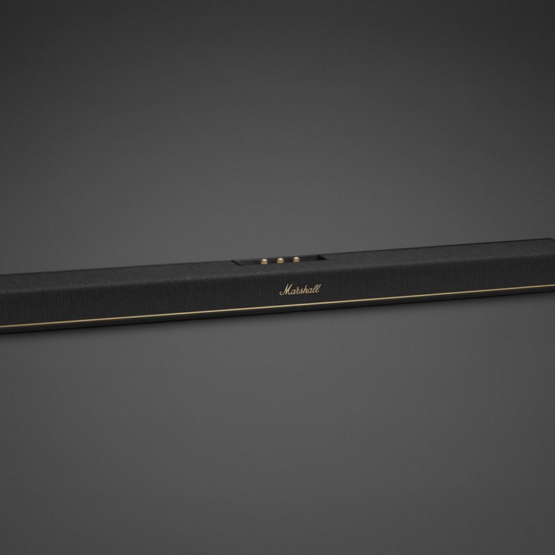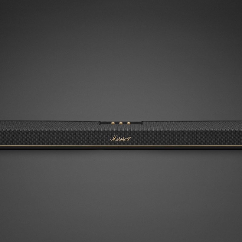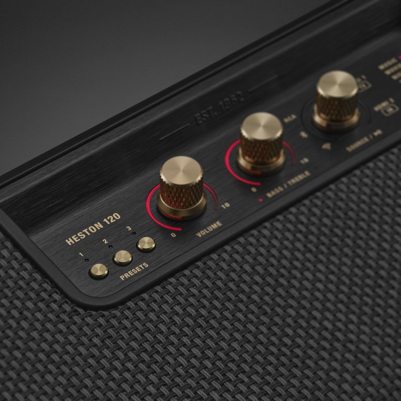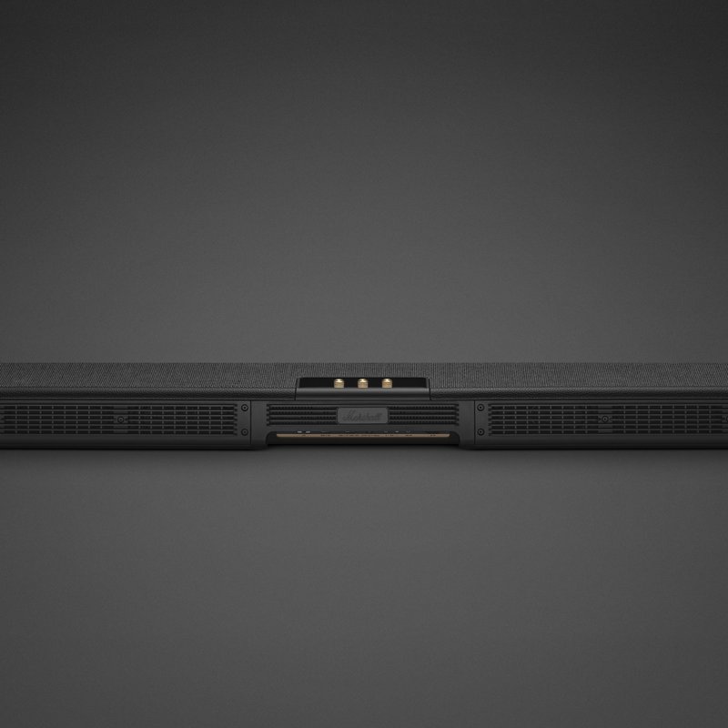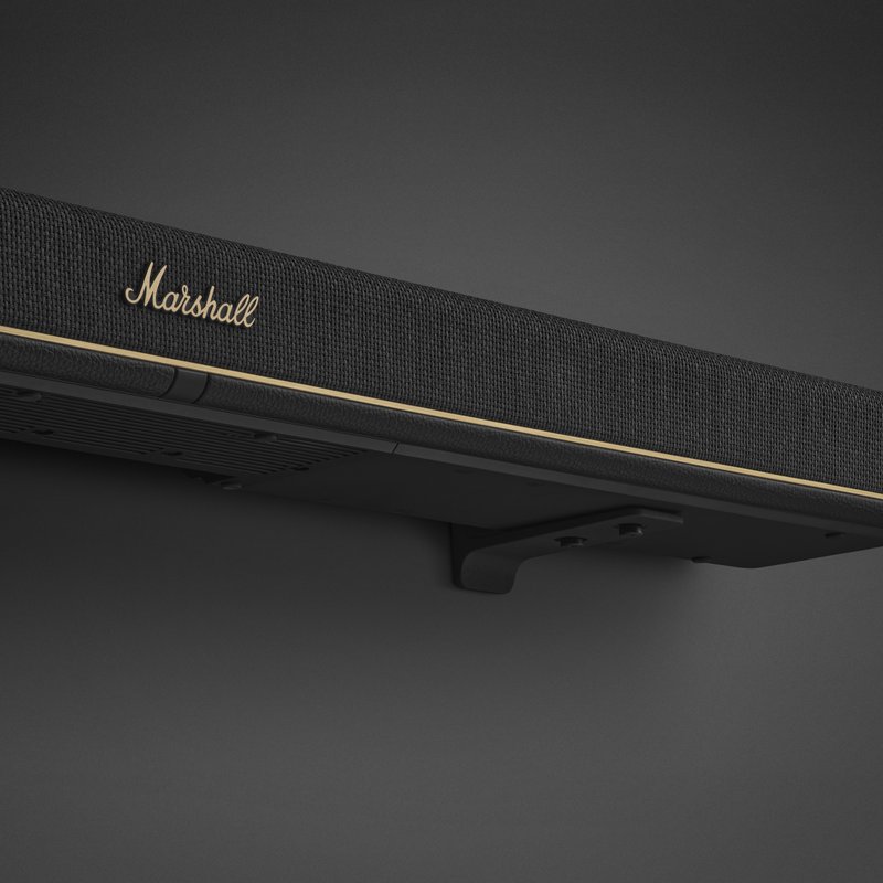 Heston 120 trả lời thẳng câu hỏi này: cả hai. Kích thước 1100 × 145 × 76 mm cho phép đặt trước TV hoặc treo tường mà không bị chắn màn hình. Lưới vải thô quen thuộc, logo Marshall nổi trên nền đen, chân kim loại nhỏ — nhìn ngay ra chất Marshall mà không cần đọc nhãn.