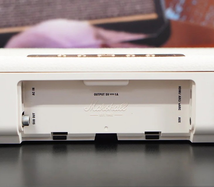 Marshall thiết kế sẵn các ngàm treo phía sau. Khi treo lên, loa ốp sát vào tường, giấu dây rất gọn. Với vẻ ngoài như một chiếc Amply cổ điển, nó xoá bỏ cảm giác "đồ điện tử lạnh lẽo" mà các loại soundbar nhựa đen bóng thường mang lại.