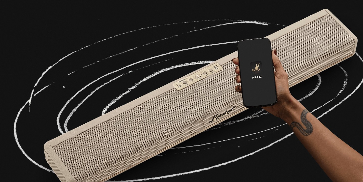 - Marshall đã tính toán kỹ kích thước này. Với chiều cao chưa đầy 7cm, Heston 60 nằm lọt thỏm dưới gầm của hầu hết các dòng Smart TV (Sony, Samsung, LG) mà không che mất cạnh dưới màn hình hay mắt nhận tín hiệu hồng ngoại.
