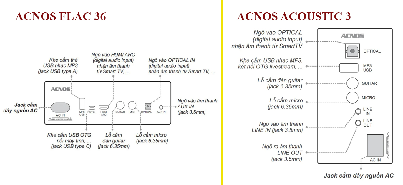• Acnos Acoustic 3: Ngoài các cổng kết nối cơ bản như MP3 USB, Optical, Line In và Line Out, Acoustic 3 còn có thêm cổng micro, guitar và các cổng chuyên nghiệp. Đặc biệt phù hợp cho những ai muốn kết nối với các thiết bị âm thanh khác trong dàn nhạc.