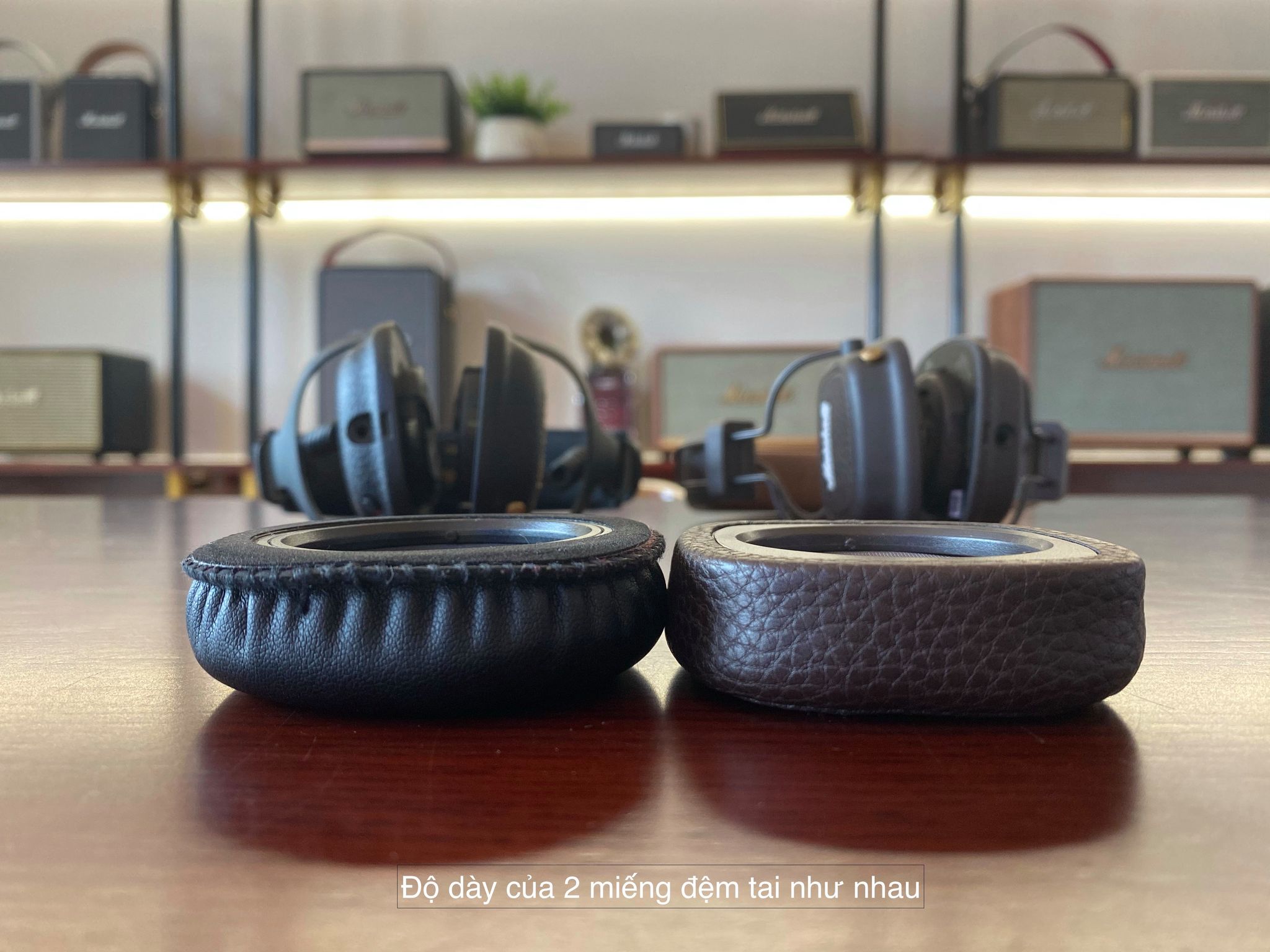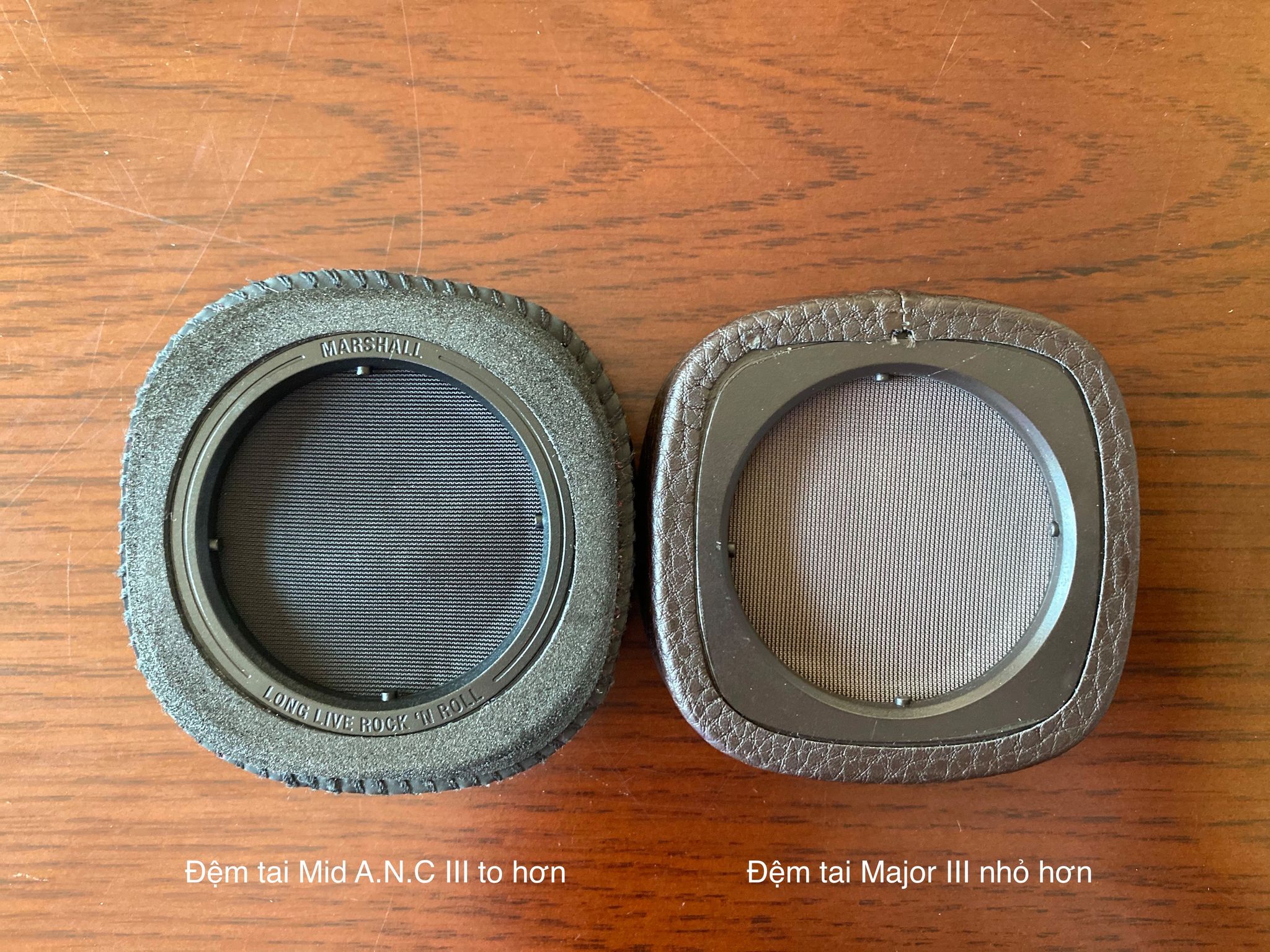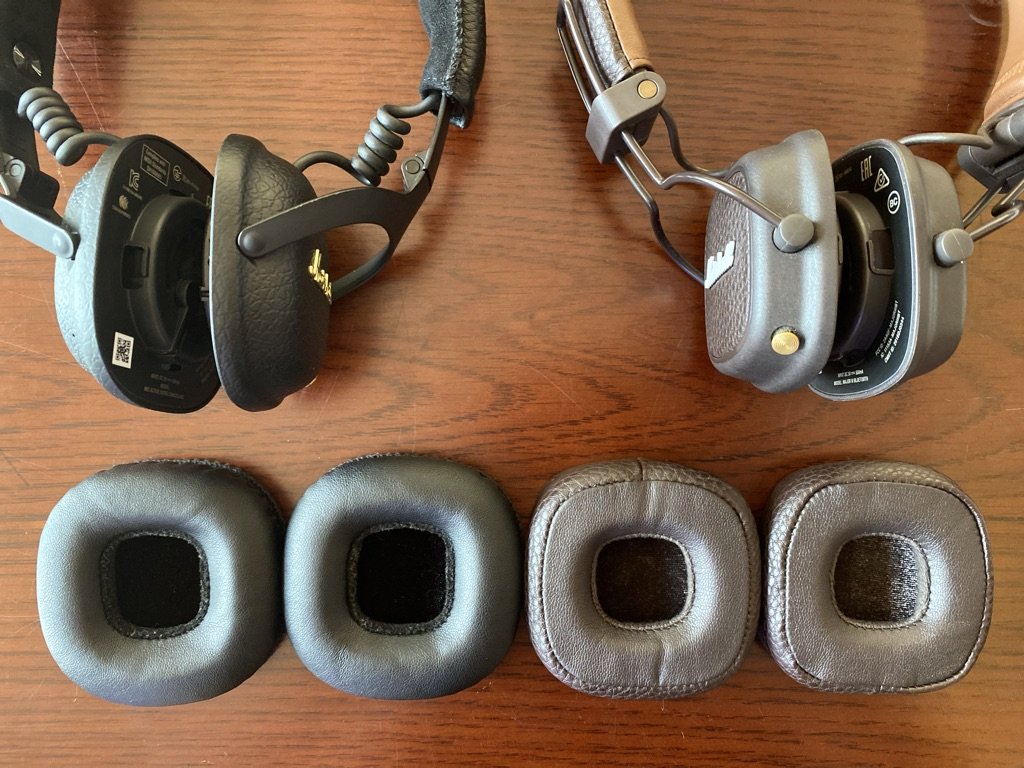+ Đệm tai Mid A.N.C to hơn Major III nhưng độ dày 2 cái là như nhau. Như trong hình, các bạn để ý phần da mịn của Mid A.N.C sẽ là vật liệu chủ đạo, bao trùm hết. Còn Major III phần da mịn chỉ là chỗ tiếp xúc trực tiếp với tai, còn phía ngoài là phần da trơn hơn.