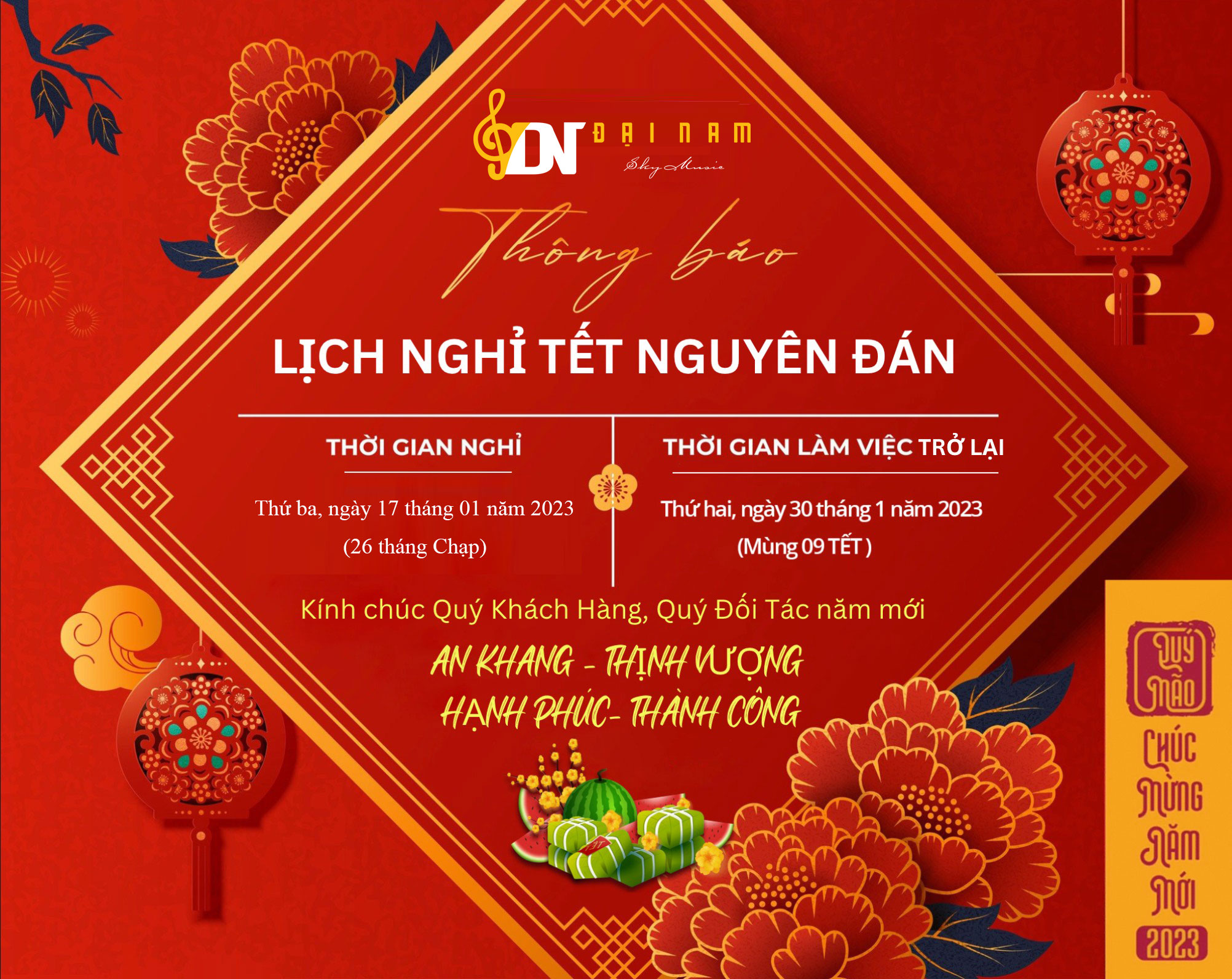 Để thuận tiện cho Quý khách và đối tác thu xếp công việc, chúng tôi trân trọng thông báo đến Quý khách hàng và đối tác thời gian nghỉ Tết Âm Lịch Mừng Xuân Quý Mão 2023 như sau: